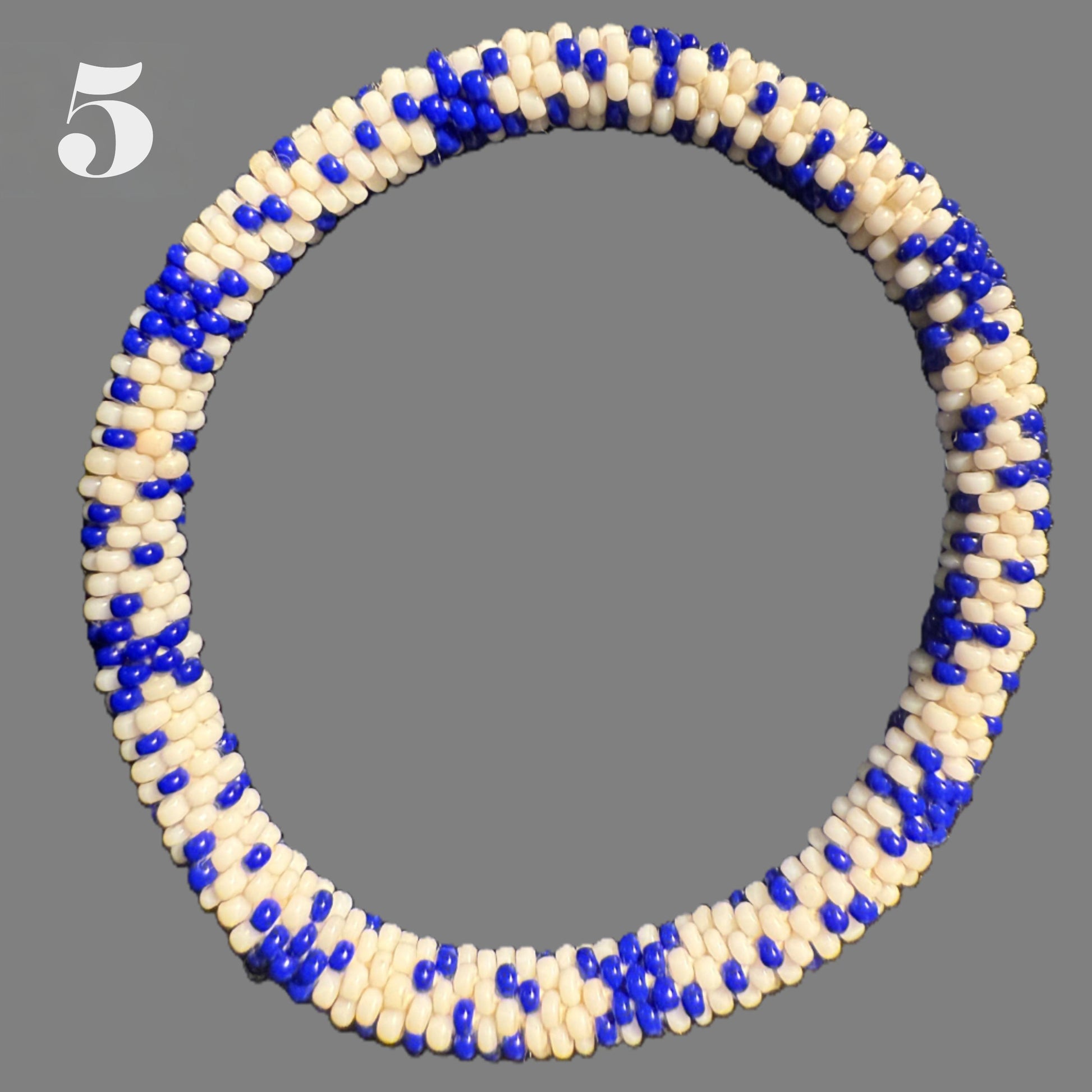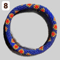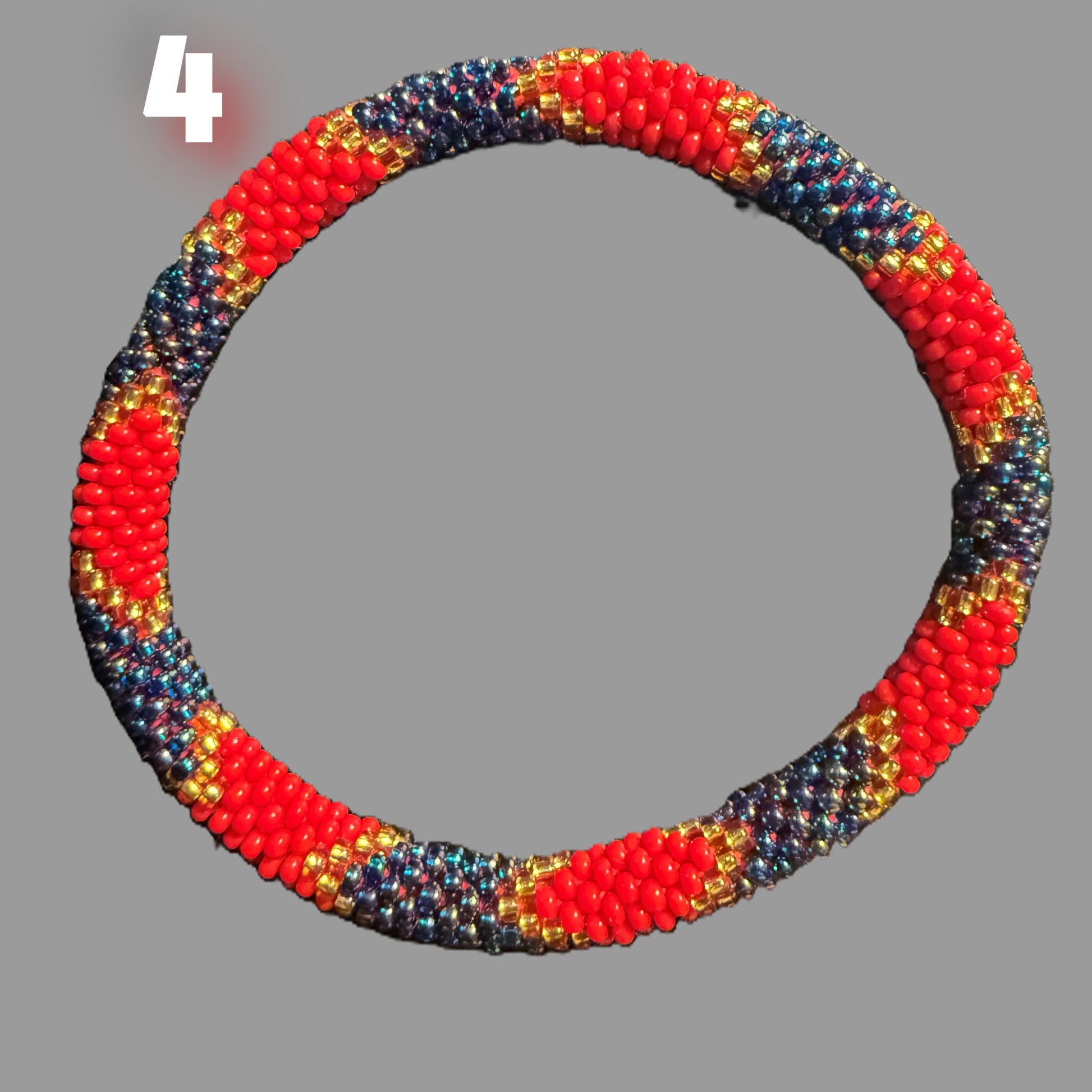each bracelet is made from hundreds of glass seed beads hand-stitched into a flexible rope design that slips comfortably over the hand.
