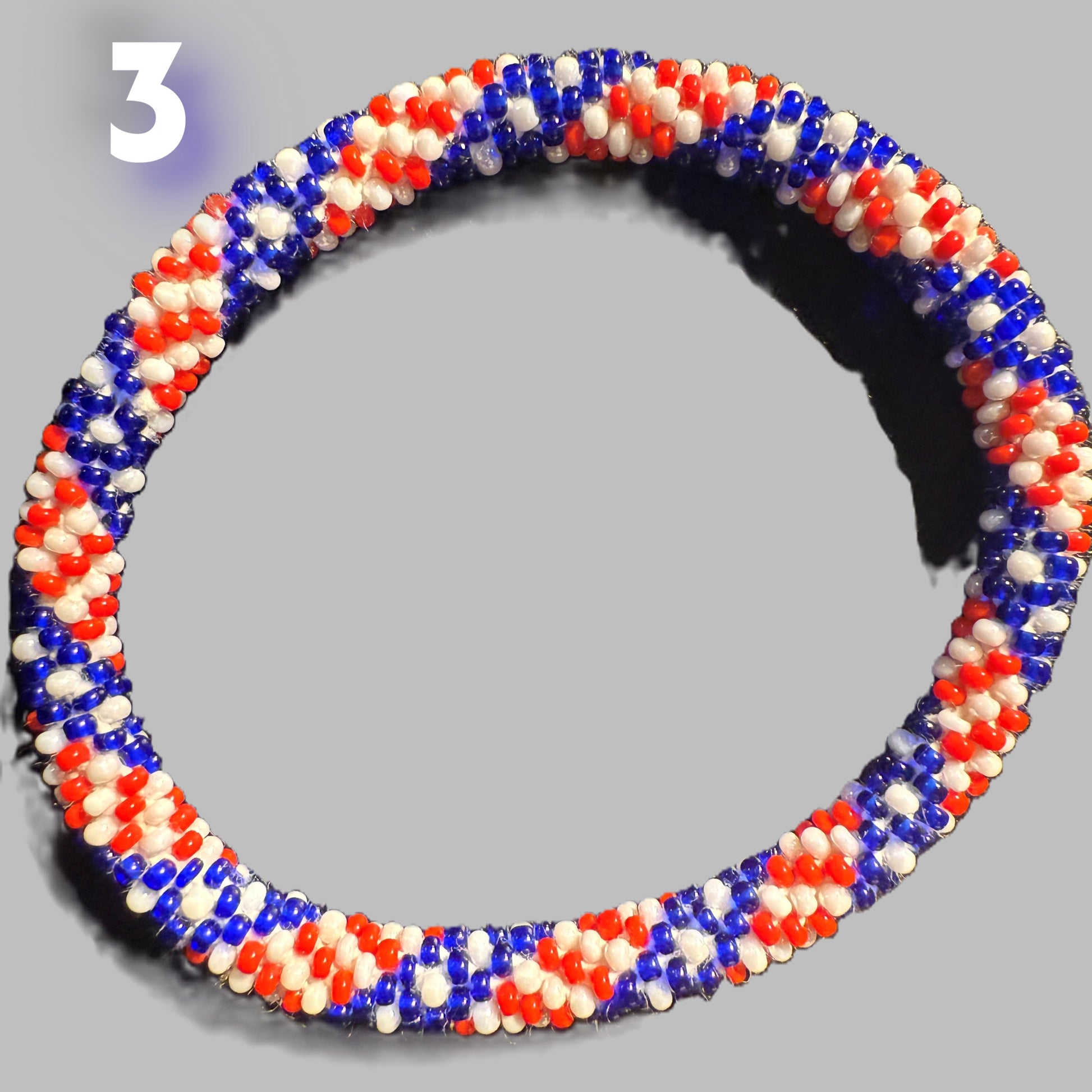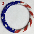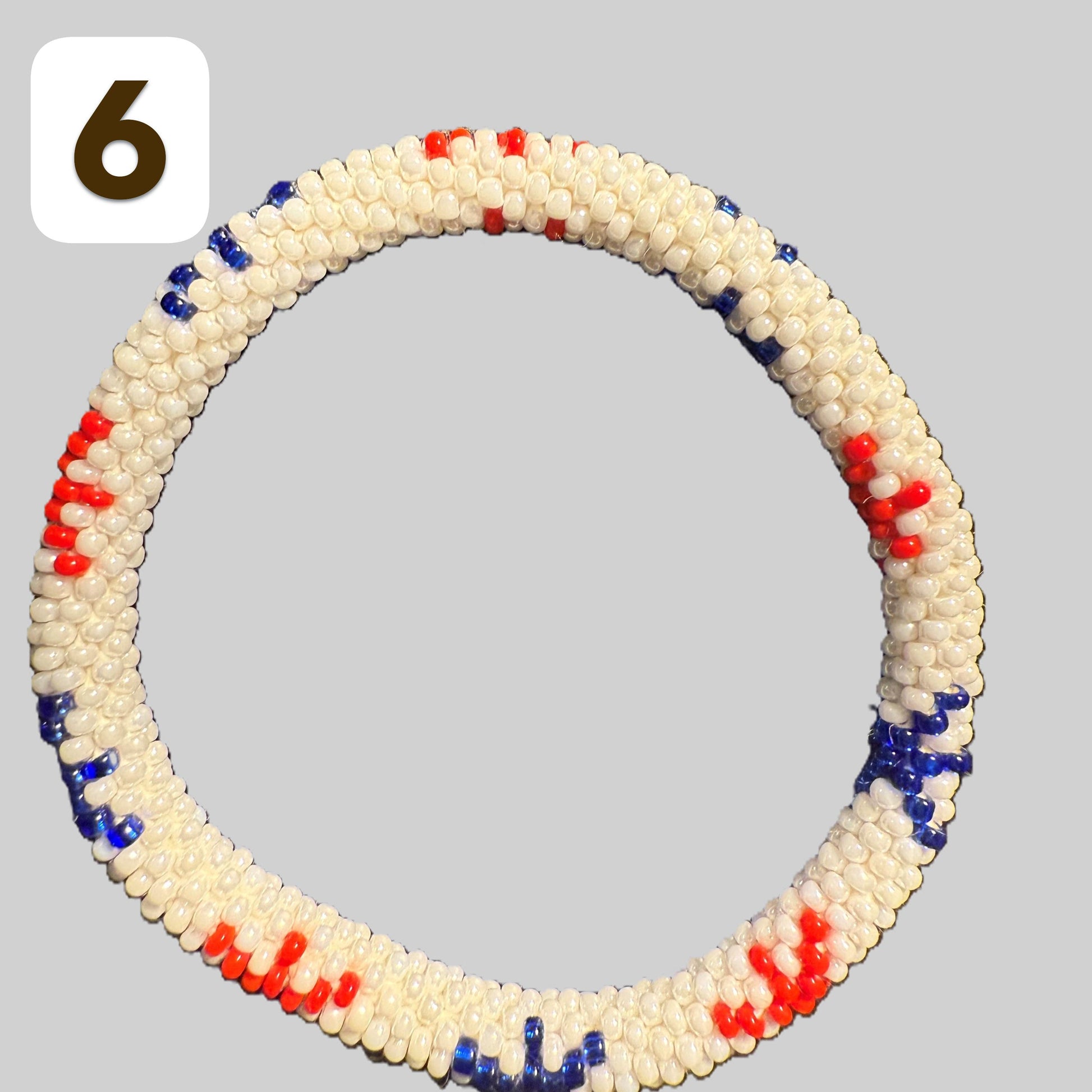this selection include all eight unique patterns shown — blended shades of several blue .red and white tones creating a beautiful combination when wearing more than one bracelet.