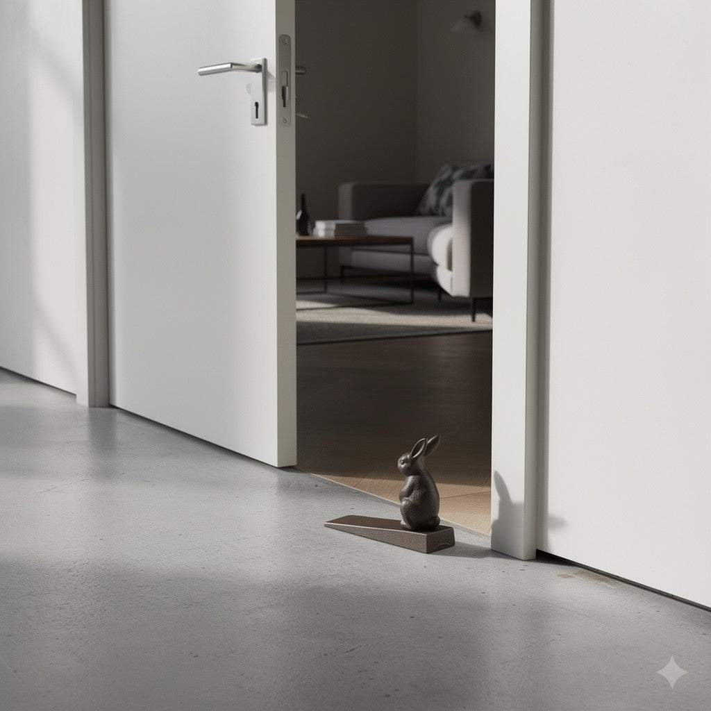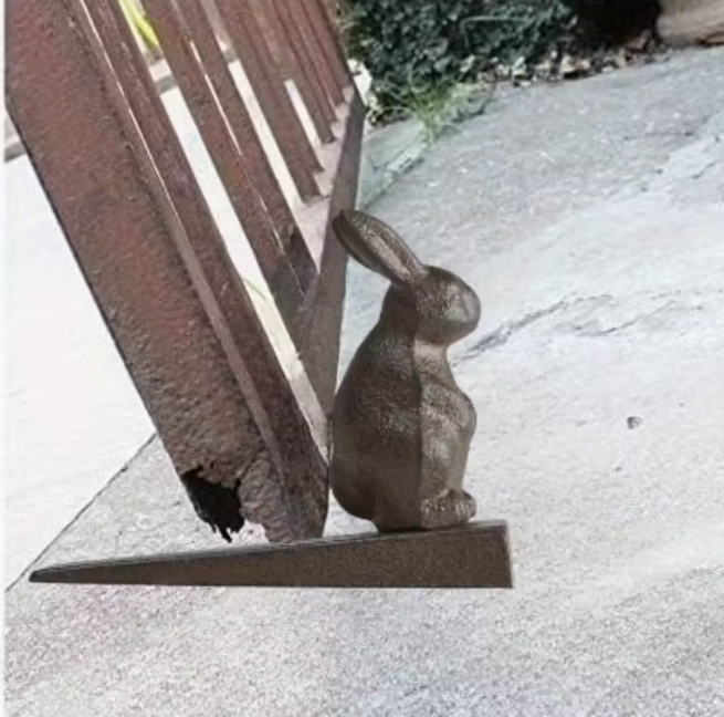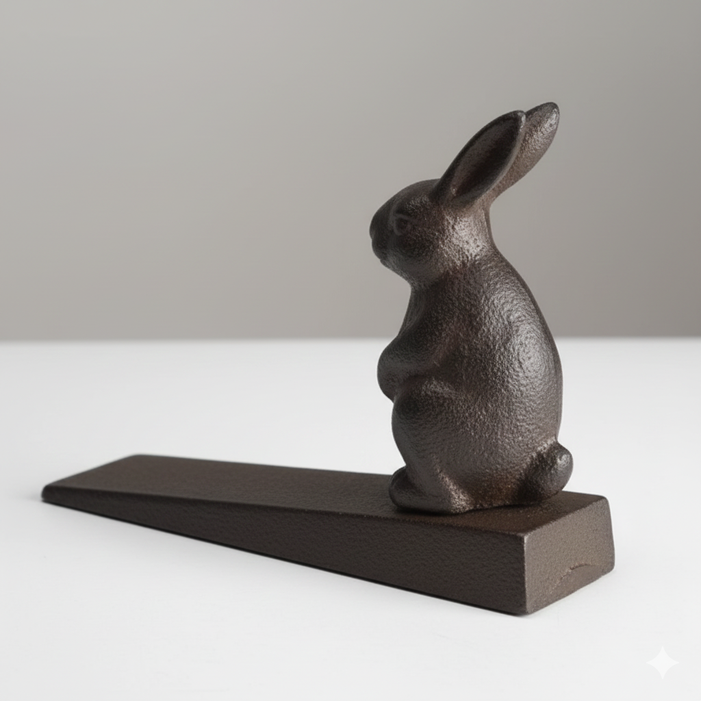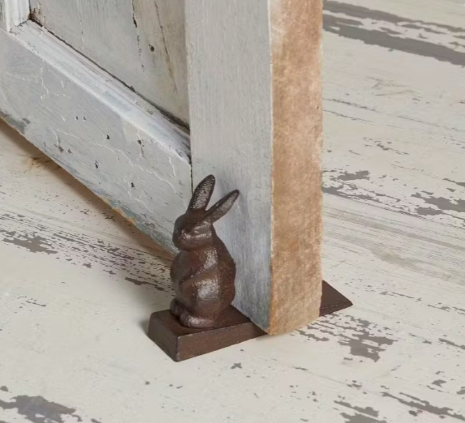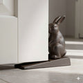 Placed at the base of the door, the solid iron wedge prevents doors from closing while the sculpted rabbit adds character and warmth.